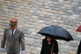 Le cortège funèbre sur le Pont Alexandre III. Comme lors du précédent, les pompiers de Paris -caserne Colombier- ont tenu à honorer les morts, au garde-à-vous, devant leurs véhicules, gyrophares en action. Dans la grosse centaine de personnes présentes, journalistes compris, figuraient également des soldats du 1er RI qui contribuent à la mission Vigipirate. (crédit Jean-Marc Tanguy).