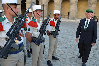 Les légionnaires font l'after : leurs anciens fixent les fourragères sur leurs uniformes. Il y a là un trio d'anciens de Kolwezi (Rodet Loew, Dary, Gausseres), mais aussi le général Bouquin (ancien chef de corps du 2e REP et ancien COMLE), et des vétérans, en blazer et béret vert.