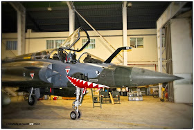 Corse (créé en 1943), unique escadron de chasse de la plateforme, avec sept Mirage 2000-5 et 2000D. L’escadron a, pour l’occasion, peint de belles dents de requin sur les museaux de certains de ses avions.
